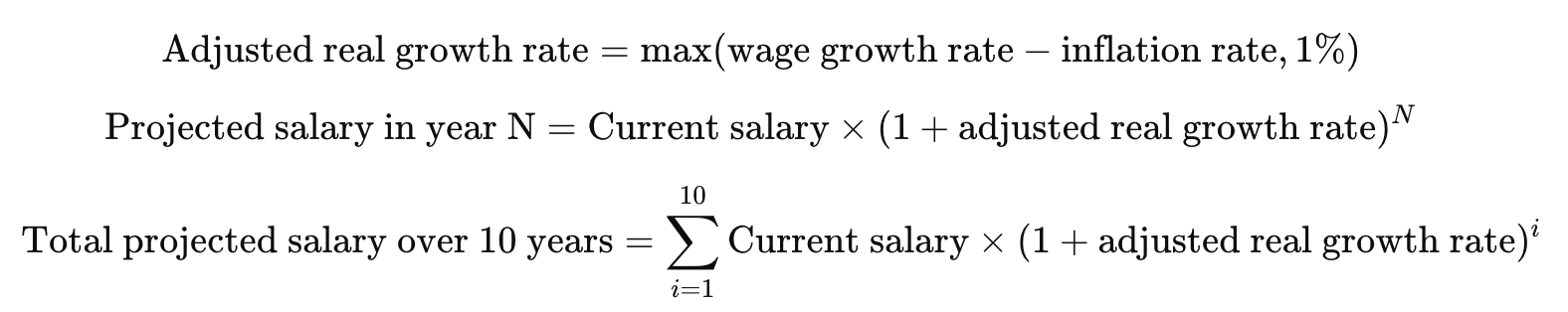 Projected salaries are calculated using this adjusted real growth rate over the selected time horizon as follows: